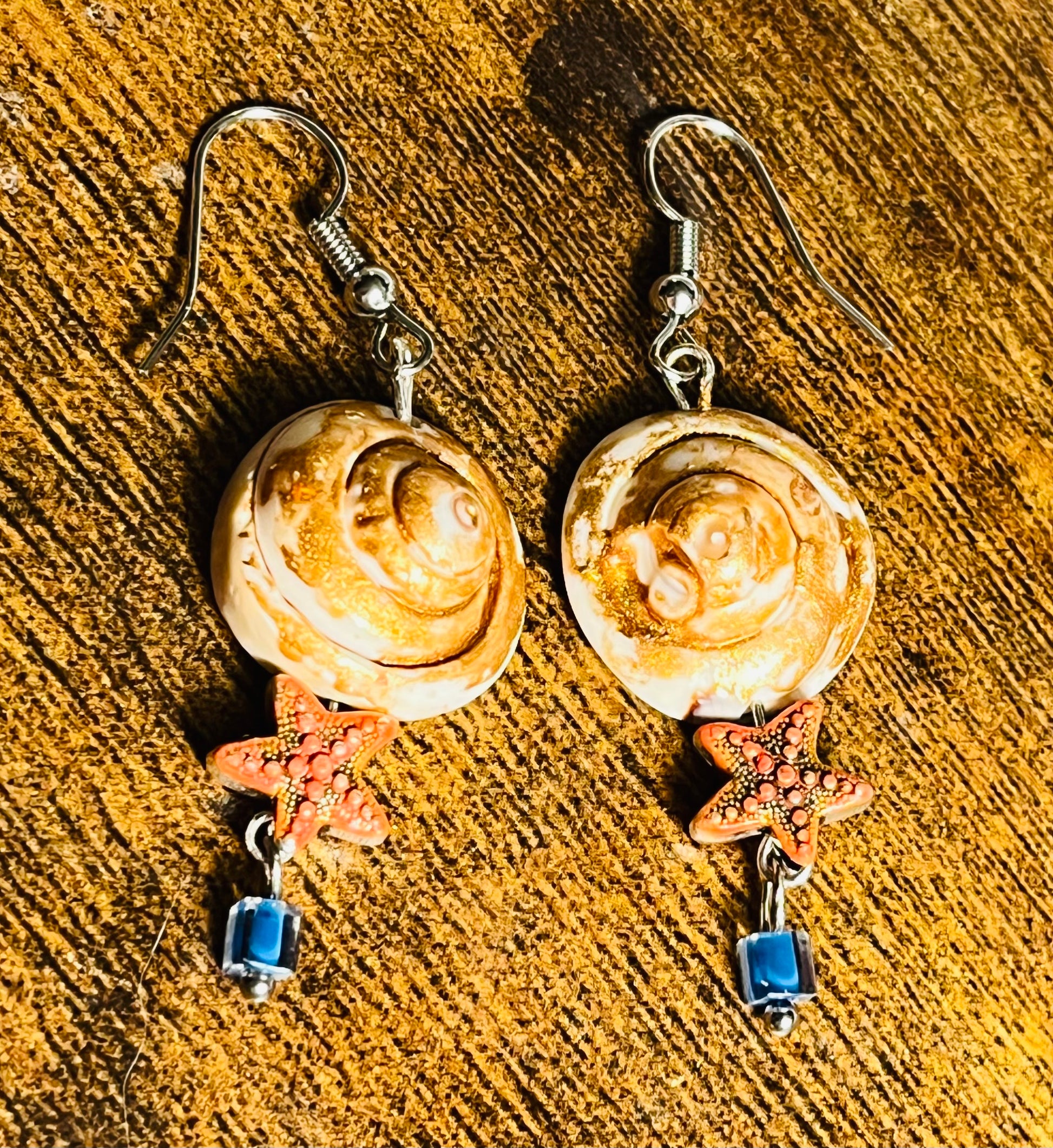 These earrings are about 2 inches long. Featuring beautiful shells painted with copper color, orange starfish beads and a small blue square glass bead dangle.